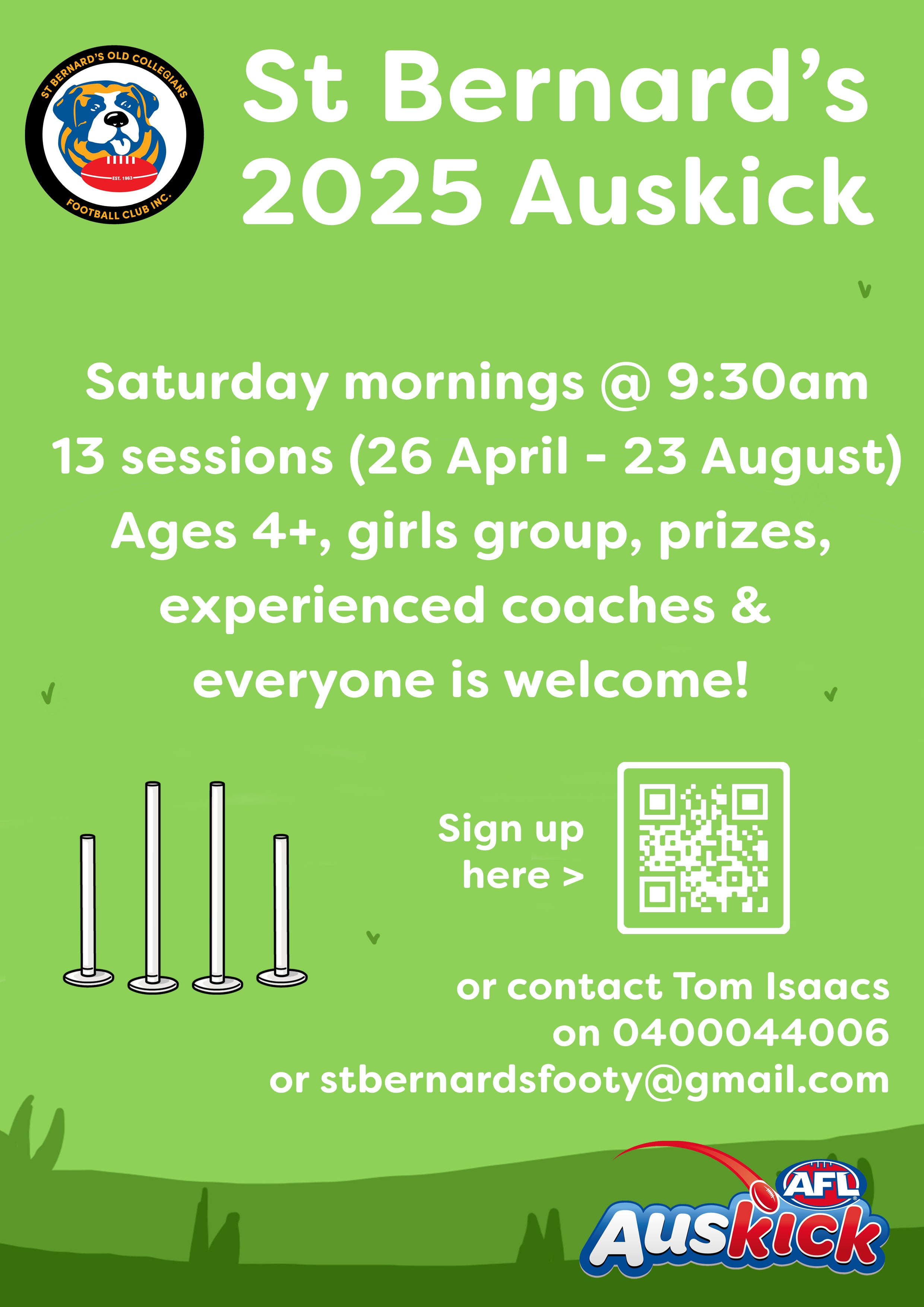 Auskick is the opportunity for kids aged 4+ to learn and play Australian Rules Footy. Our Auskick program, held on Saturday mornings on the St. Bernards’ College ovals, offers kids the chance to learn and practice their skills over 13 sessions with experienced coaches and ample ground space.